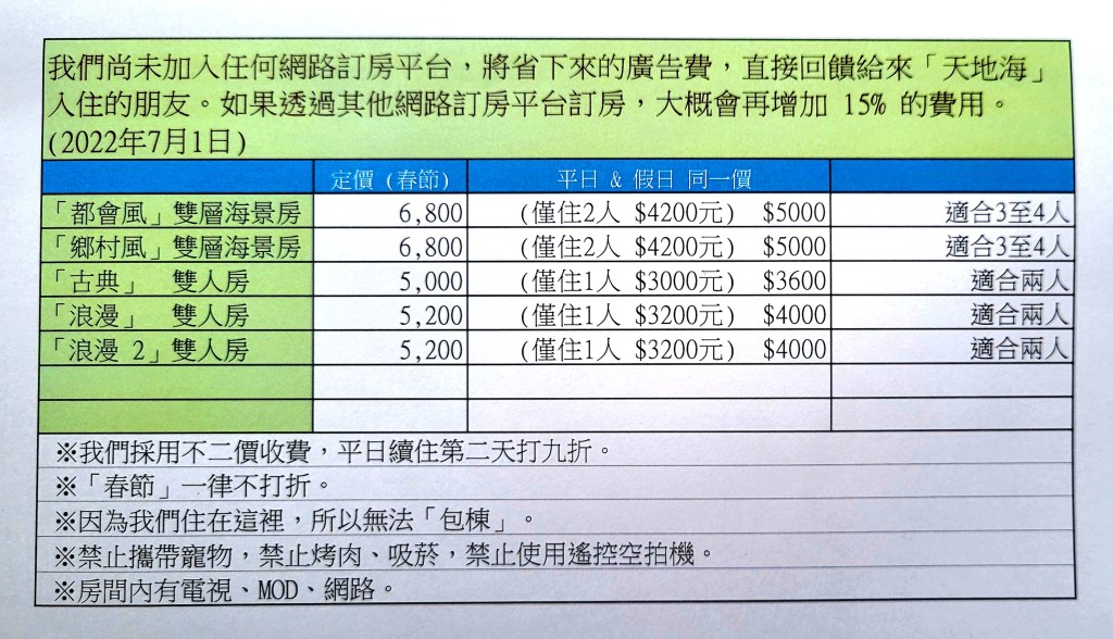 ※目前,我們還沒有參加任何一家「網路訂房平台」的廣告與訂房系統,我們將省下來的廣告費,直接回饋給喜愛「天地海」的房客朋友。但是,如果透過旅行社、「民宿網」或任何旅宿網路平台訂房,可能會被加收15%的仲介費用,敬請見諒!